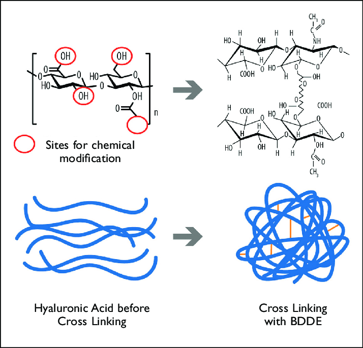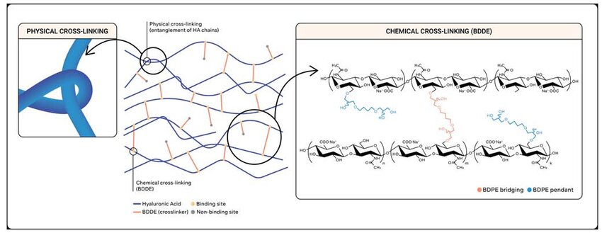 - สาร cross linked ที่ว่าคือ จะสร้างพันธะเคมีเชื่อมเหมือนสะพานระหว่างโซ่ HA 2 สาย เช่น : BDDE (1,4-butanediol diglycidyl ether) — ตัวเชื่อมขวางที่พบมากที่สุดและปลอดภัยที่สุด • อื่น ๆ (DVS, PEGDE)