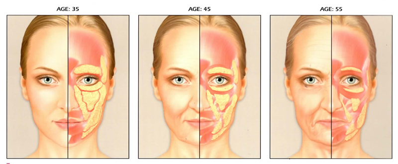 • ไขมันชั้นตื้นไหลลงด้านล่าง → เกิด jowls, หน้าดูหย่อน